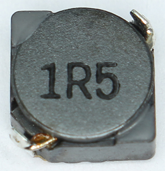 文字符號法是由數(shù)字和文字符號組成,按照一定的規(guī)律把電感的標(biāo)稱值和偏差值標(biāo)示在電感上面。這種表示方通常用在一些小功率電感上面,單位一般是nH 或pH分別用“R”和“n”表示小數(shù)點。如下圖是某電感用文字符號法表示的,這里1R5則表示電感量為1.5 μH。